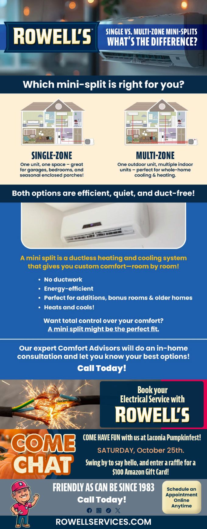 "Friendly As Can Be Since 1983!" When you need help with your plumbing, drains, heating, cooling or electrical in New Hampton, you can always rely on Rowell's Services! Call us now or book online!